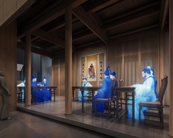中正平和,成為“中庸之道”的主要內涵和重要體現,展館空間結合建筑軸網安排,形成中正平和,有序組織的空間布局形態,成為設計理念在空間設計上的體現。整體設計以柔和的和諧氛圍呈現,弱化設計形態、色調,材質上的互沖,體現儒學所蘊含的和善思想與和合精神。